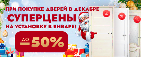 В декабре мы дарим всем нашим покупателям межкомнатных дверей СУПЕРСКИДКИ до -50% НА УСТАНОВКУ ДВЕРЕЙ В ЯНВАРЕ*.