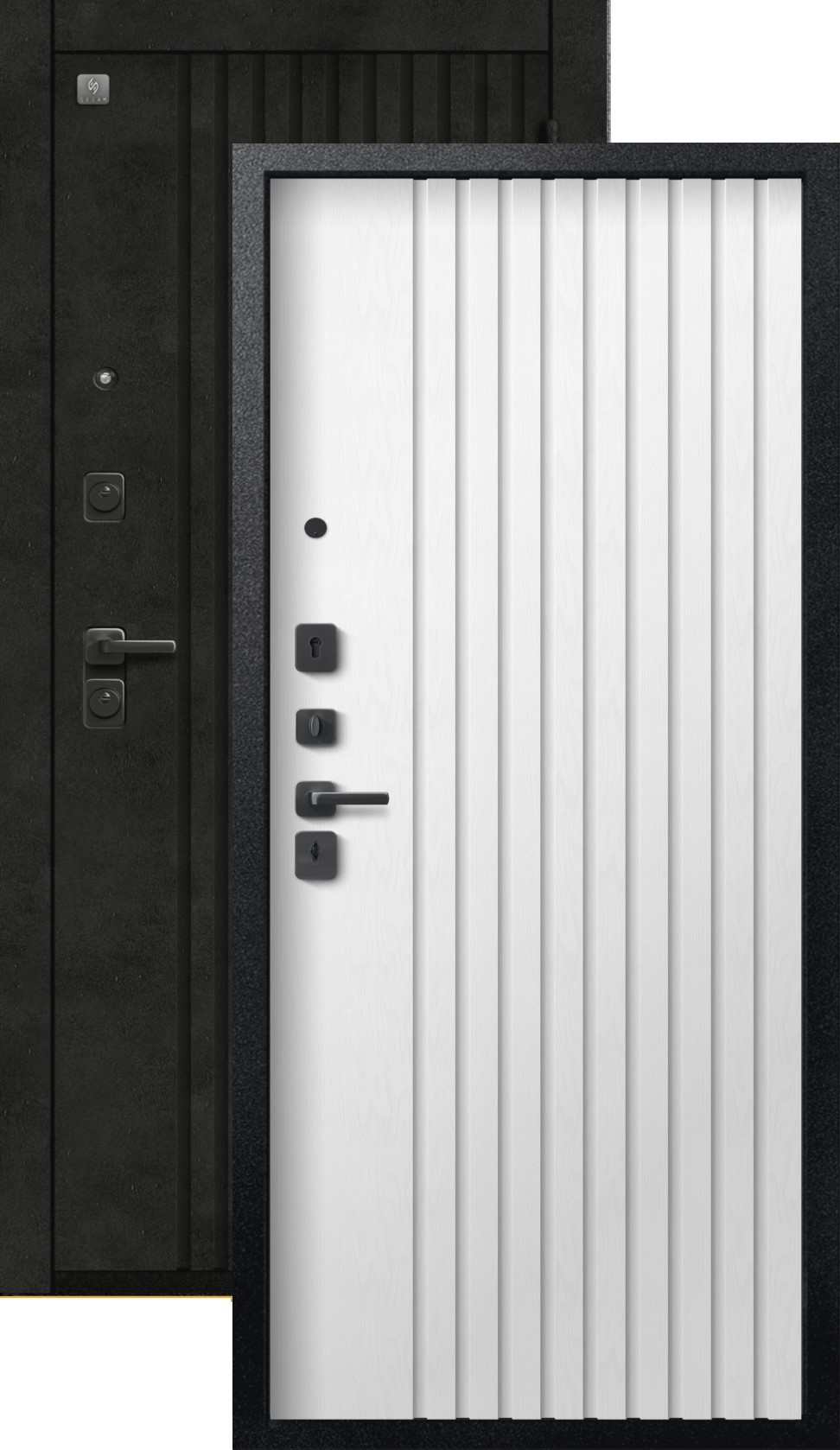 Повышенной надежности российская дверь со стильной внешней отделкой муар черный/бетон темный и красивой декоративной панелью толщиной 8 в цвете софт ясень белый. Прекрасно подойдет для установки в квартиру. Солидная модель, которая хорошо защитит и подчеркнет статус.