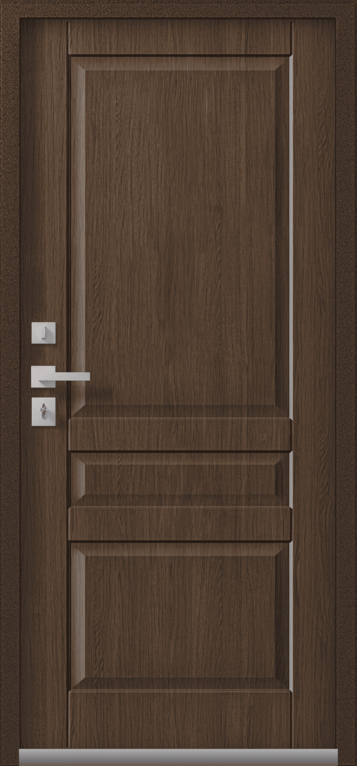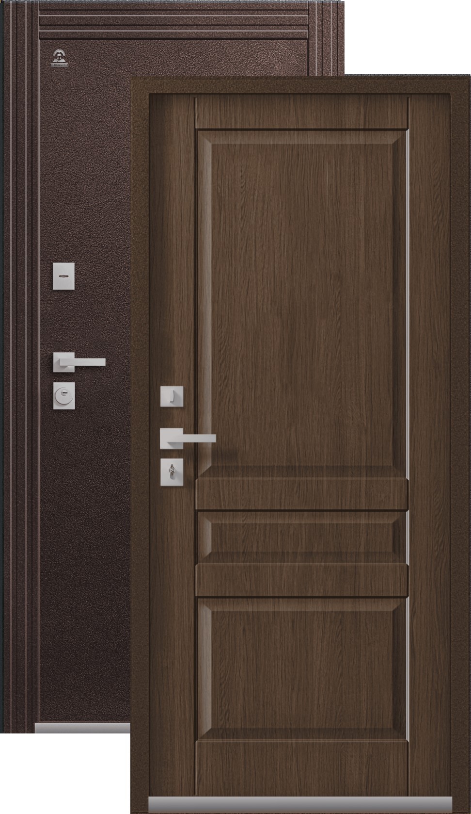 Имеет очень высокую прочность, благодаря толстой стали 2 мм. Оснащена двумя надежными замками, минимум один из которых имеет высший класс взломостойкости по ГОСТ 5089-2003 (4 класс). Есть врезная броненакладка, защищающая цилиндровый замок от высверливания. Она утоплена в дверное полотно, поэтому ее практически невозможно сбить. Есть ночная задвижка — дополнительная защита от взлома. Никто не сможет зайти, вскрыв замок, когда вы дома.